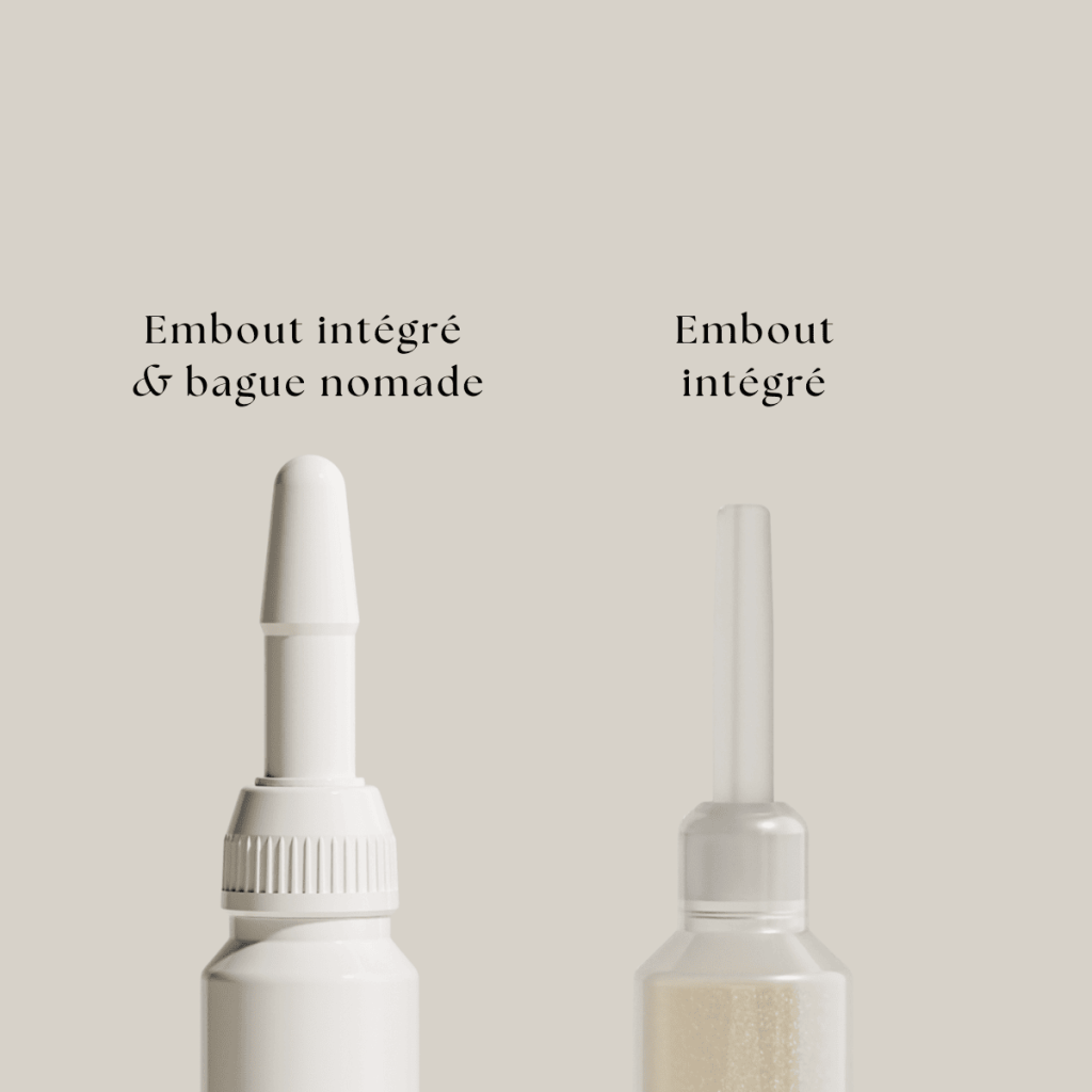 - Une tête sécable avec applicateur intégré + une bague nomade, garantissant une étanchéité optimale pour éviter toute fuite, même si l’ampoule est renversée.
